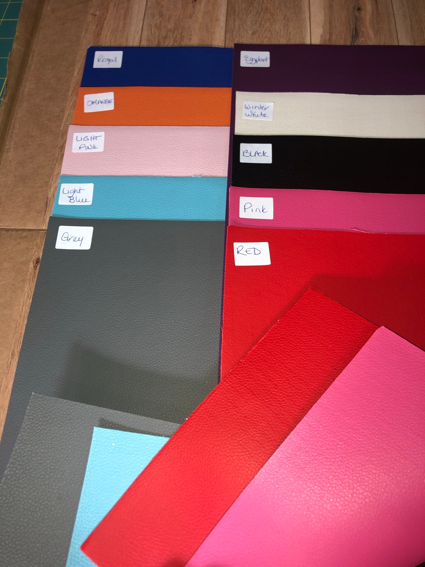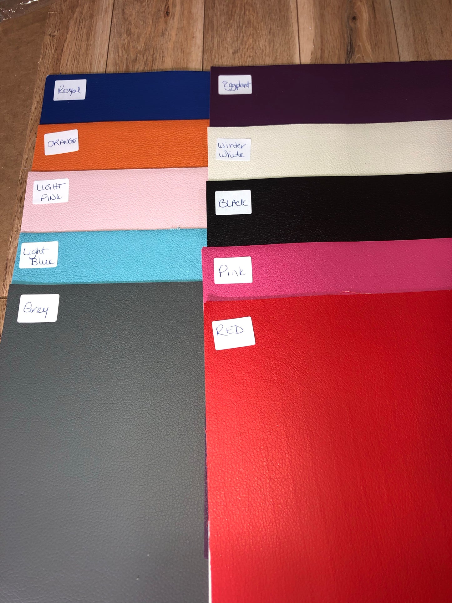 This litchi faux leather is the same on both sides. Is colored with no white backing.