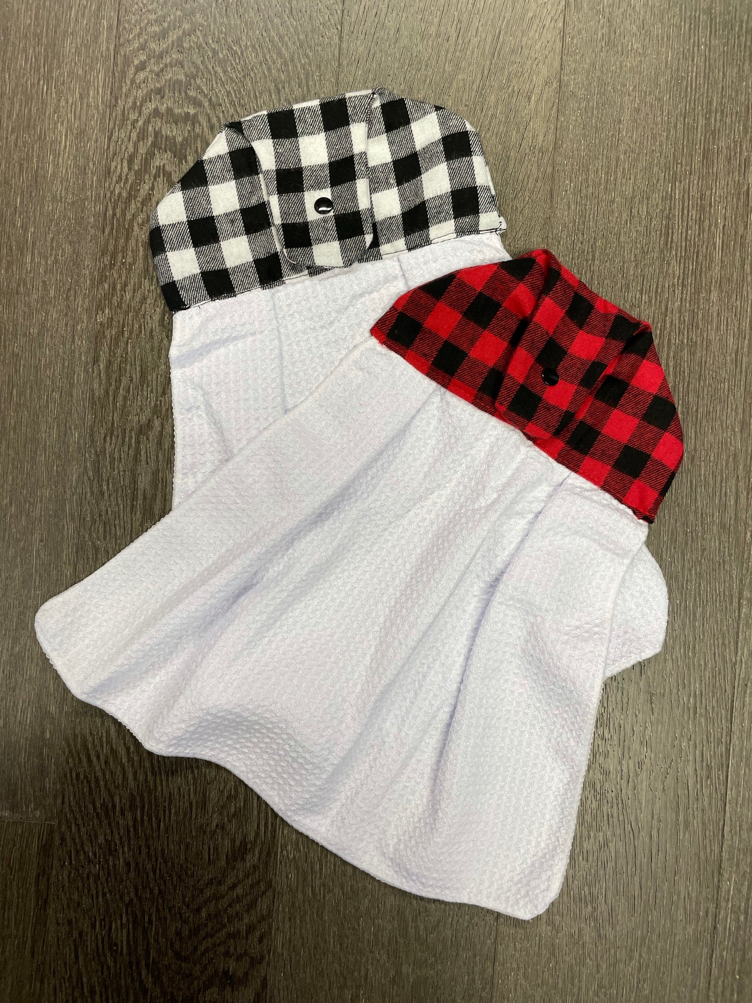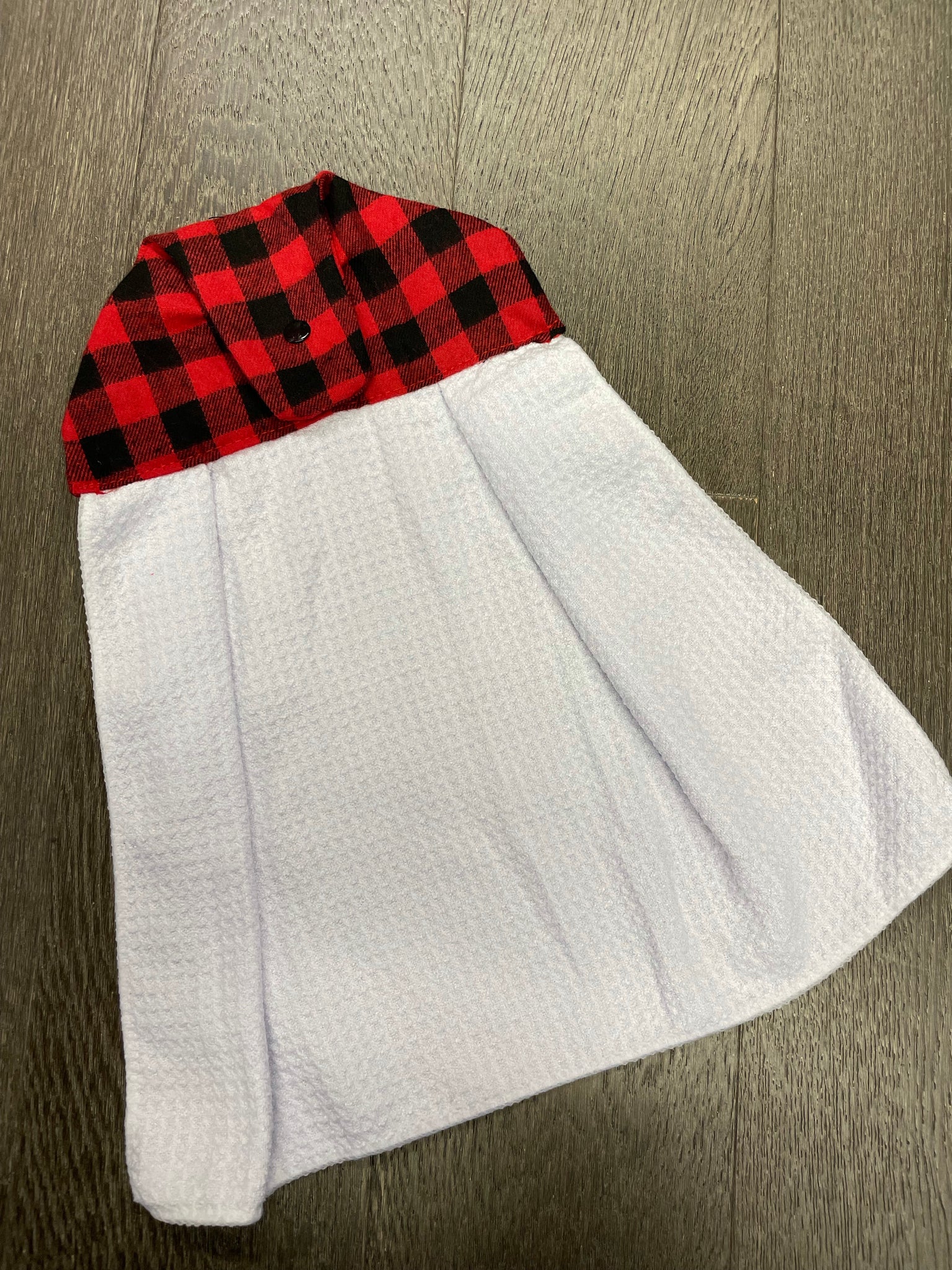 These waffle weave tea towels are half size and topped with a plaid hanger topper.