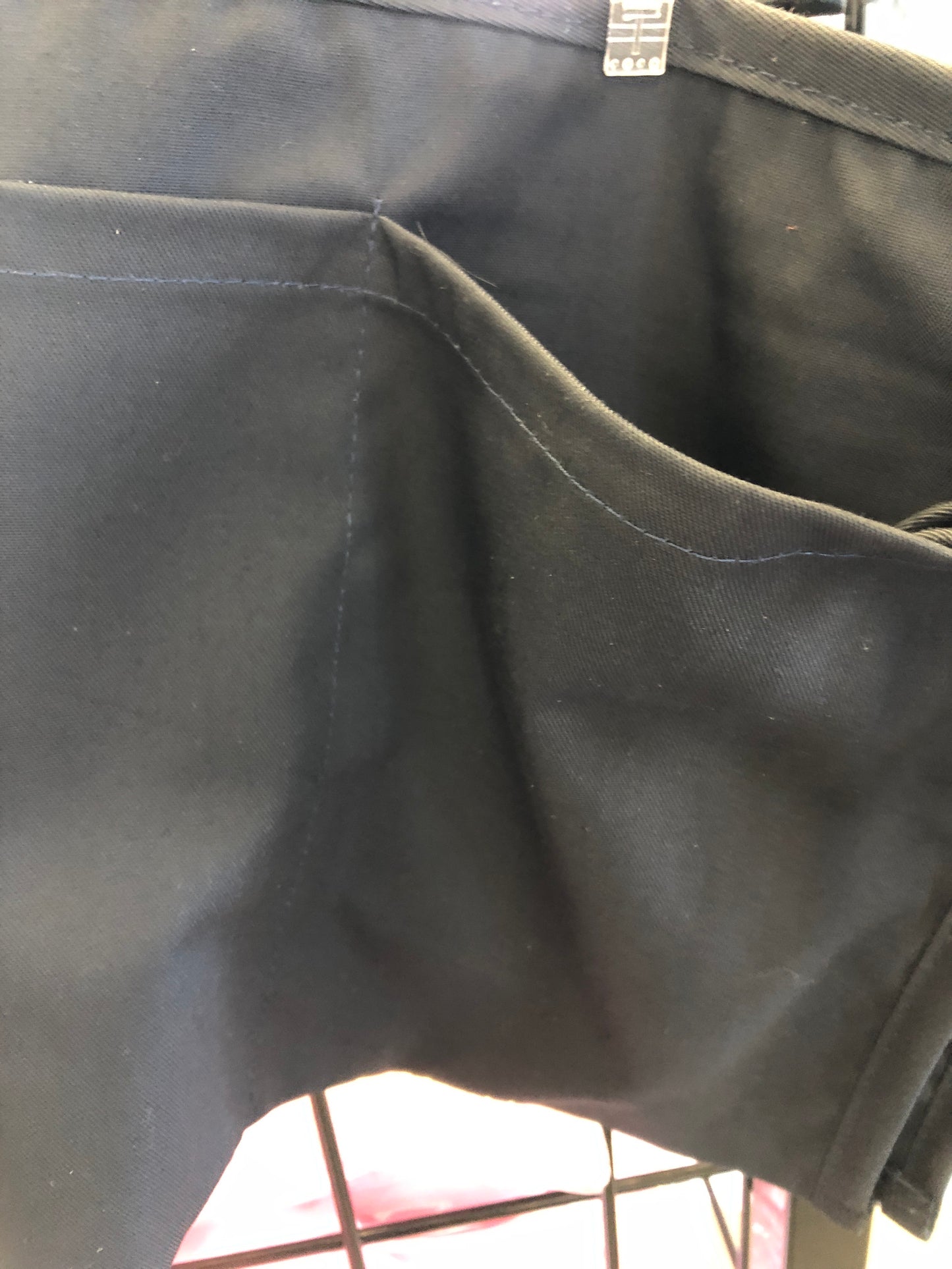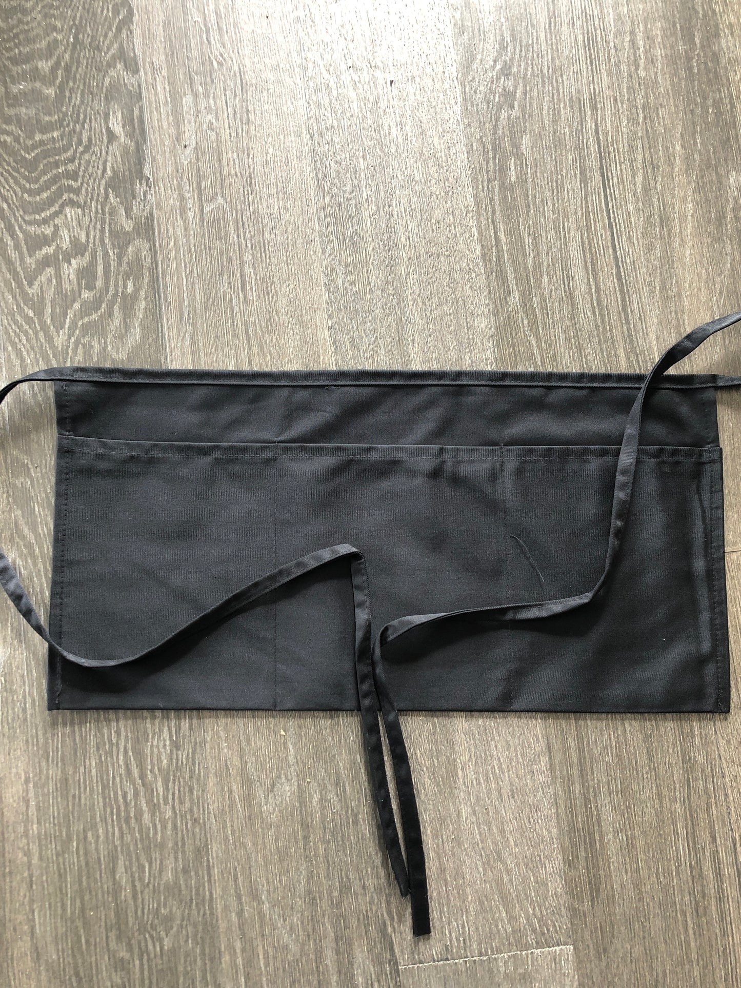 These waist style aprons are 65% Polyester and 35 % Cotton Twill .  They have three pockets on the front.