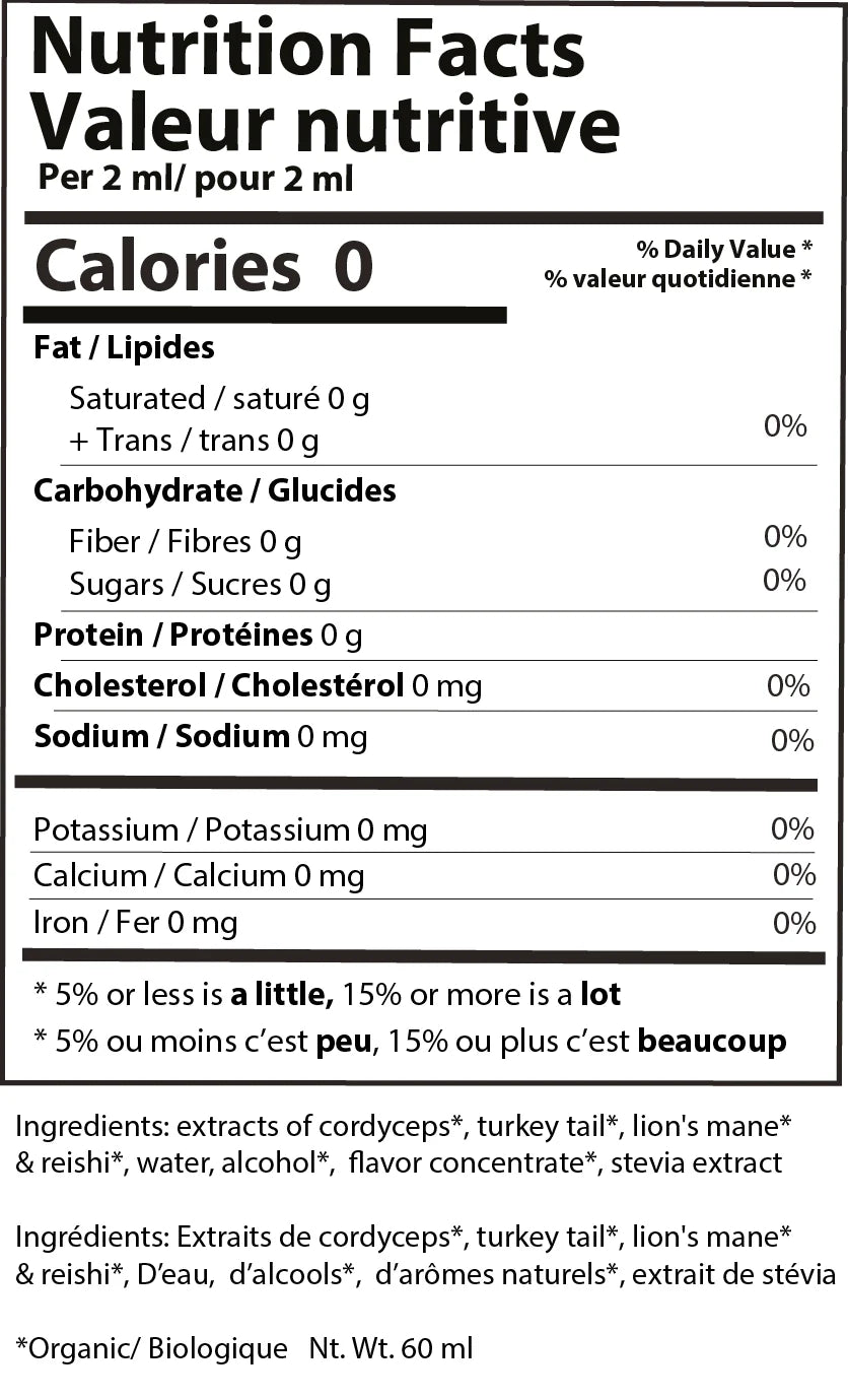 EXTRACTS OF CORDYCEPS*, TURKEY TAIL*, LION'S MANE* & REISHI MUSHROOMS*, WATER, EXTRACTION SPIRITS*, ORGANIC, PLANT-DERIVED FLAVOR CONCENTRATES*, STEVIA