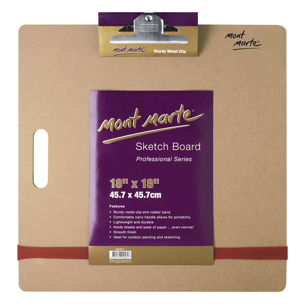 The Mont Marte Sketch Board is ideal for outdoor sketching, but may also be used in the studio or classroom. The large rubber band and clip holds your sketch pad securely in place. Constructed from 3mm masonite that provides a smooth durable drawing surface. Llightweight sketchboard with easy-carry handle.