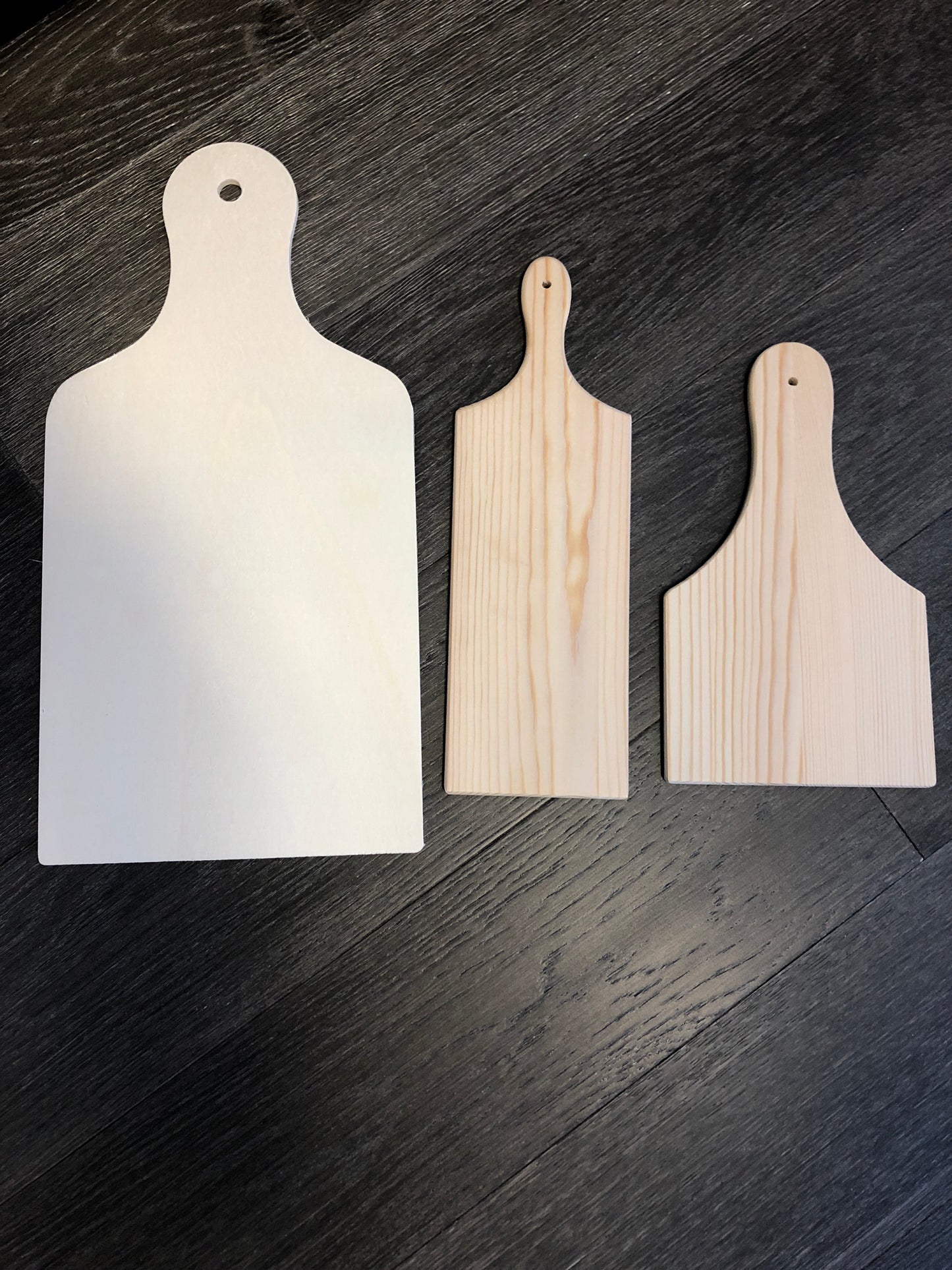 These unfinished wood paddles (Bread board style ) are available in assorted sizes.